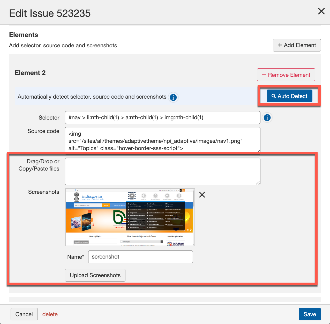 Adding a Screenshot to an Issue