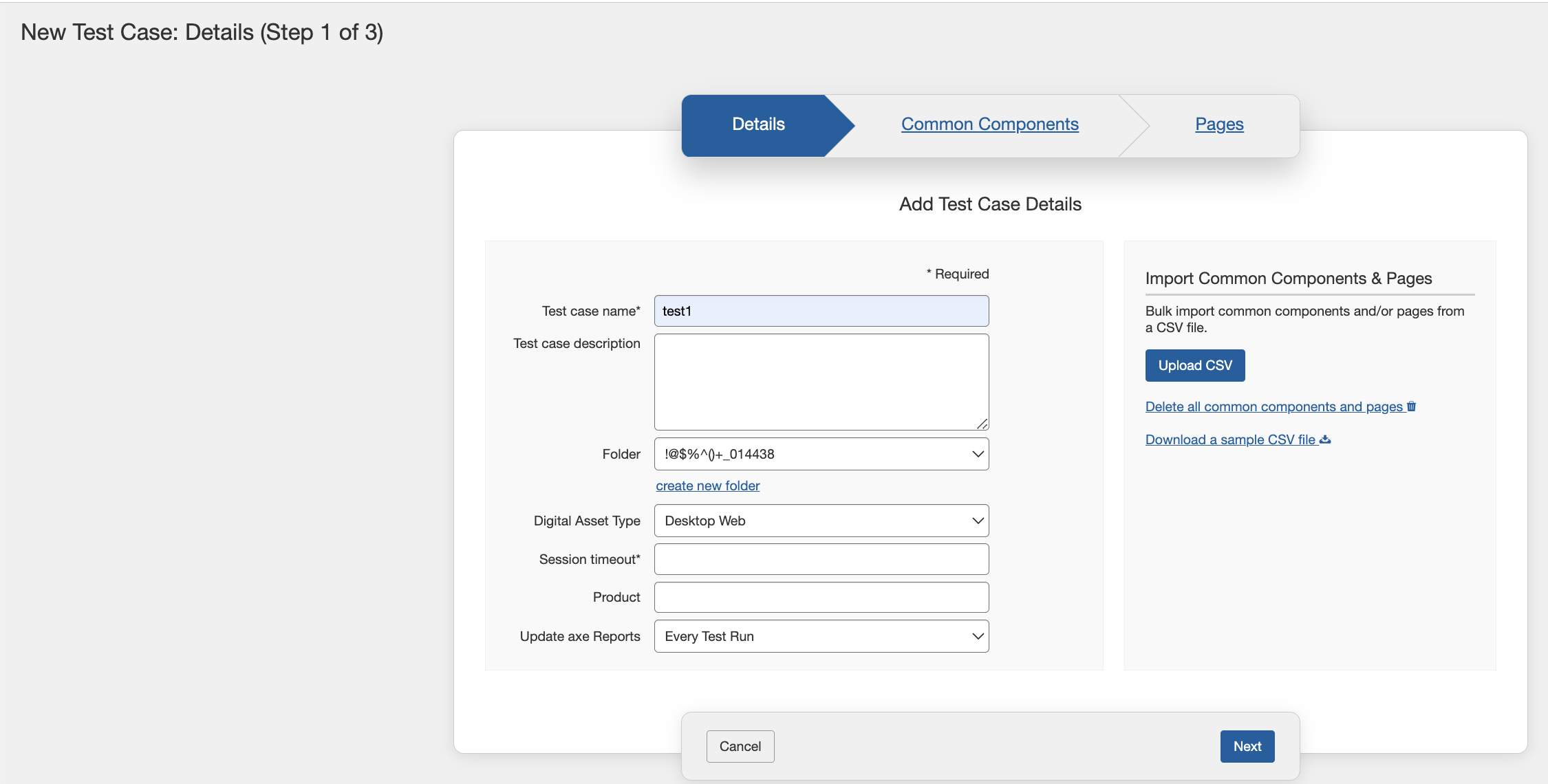 On the Details panel of the Add Test Case screen, you are able to specify basic and identifying information about the test case before adding common components and pages to be tested. At a minimum, this includes giving your new test case a name. Optionally, selection and entry fields exist for describing the test case, deciding which folder it will be in, the standard to be tested against, how long the timeout is for a session within the site to be tested, and the name of the product that will be tested. It also allows you to upload the common components and pages (for the next two steps) using the Import functionality.