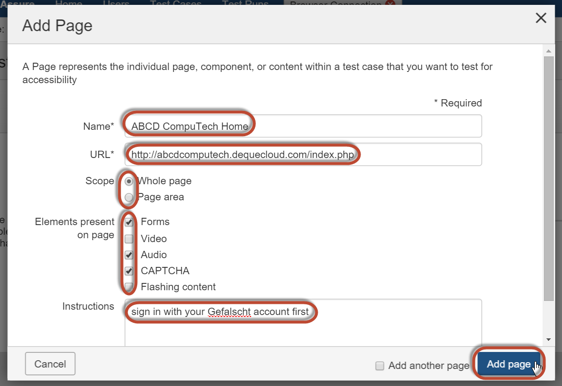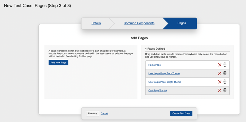 Adding at least one page to a test case is required in order to create a new test case. A Page represents the individual page or unique page-specific content within a test case that you want to test for accessibility. It can be a full webpage or a part of a page (for example, a modal). Any common components defined within a test case that exist on a specified page will not be tested as a part of the testing for that page. Currently, the minimum requirement is 1 page, and although there is technically no maximum number of pages allowed, we recommend not adding more than 30 to ensure efficiency.