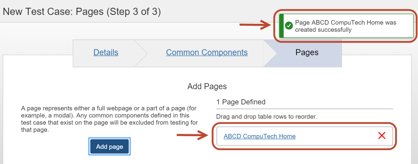 After adding, the Add Page dialog box closes and the New Test Case: Pages (Step 3 of 3) screen displays a 'page created successfully' message at the top right, and each page you add appears as an item in the Pages Defined section of the Pages panel with a Page Name link that allows you to edit the page on the Edit Page dialog box, and a red X icon that allows you to delete the page.