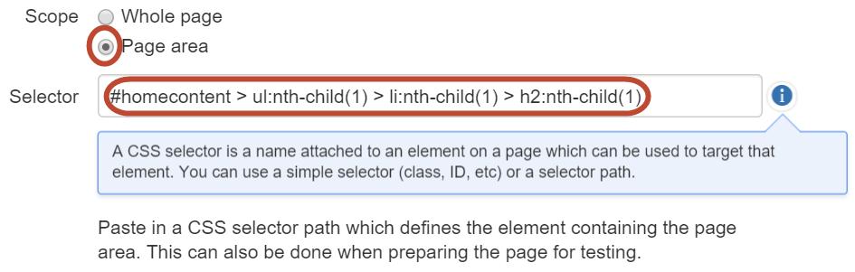 | Scope | Select the Whole page radio button option to target the entire page, or the Page area option to specify only a portion of a page. When the Page area option is selected, the Selector field appears below the Scope field, which allows you to enter the appropriate CSS Selector. This can be a simple selector such as a class or ID, or a selector path. If you are using CSS IDs, ensure you start the ID with a #. For a CSS class name, start with a period or full stop(.). Examples: #myidname or .myclassname. For more information, see CSS Selector Process. |