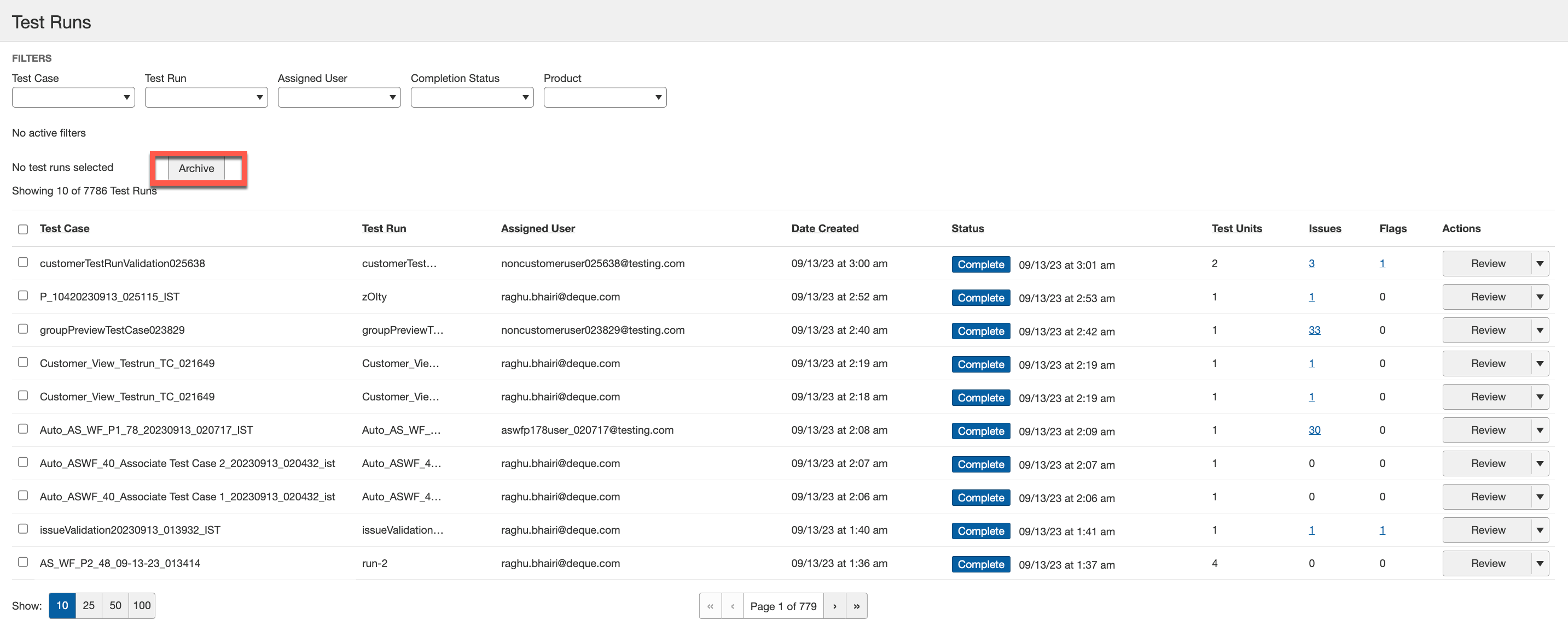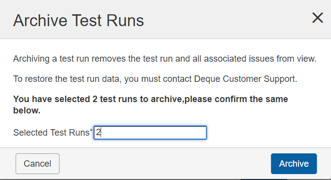 Caution: Archiving a test run removes its associated issues from view, and can only be restored by contacting Deque Customer Support.