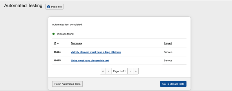 - The Automated Testing Results screen displays a system response message indicating number of issues found. Under the message, the screen displays a 3-column table of issue information (ID, Summary & Impact), followed by action options to either re-run them or navigate to the Checkpoint Tests for Page screen to begin manual testing.