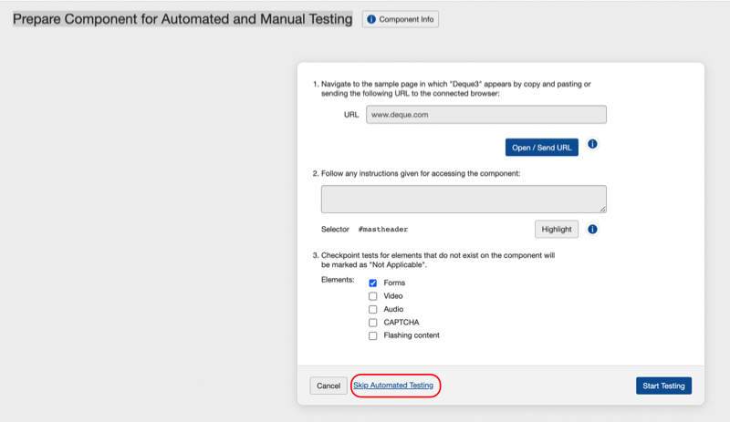 The 'Prepare COmponent for Automated and Manual Testing' screen offers a Skip Automated Testing link, that when activated, will advance you to the 'Prepare (Component or Page) for Manual Testing' screen.