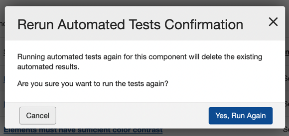 When You Rerun Automated Tests: A confirmation message is displayed confirming whether you want to run the automated tests again. Activate the button, Yes, Run Again to rerun the automated tests.
