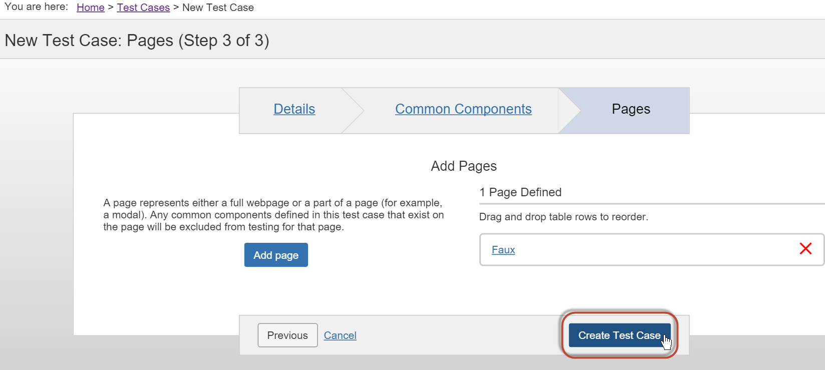 After providing the details, activate the Create Test Case button at the bottom, right of the Pages panel.