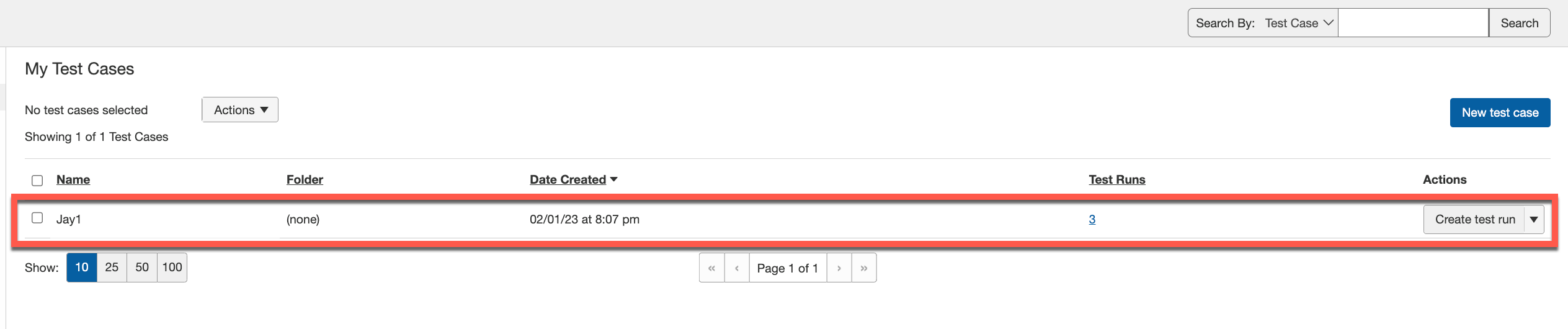 For the new test case you created, the Actions column of the Test Cases screen now allows you to select either the Create test run, Save as new test case, or Archive options.
