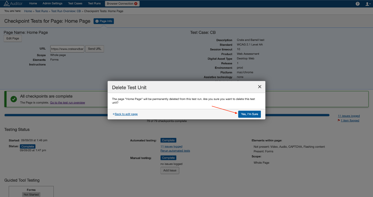 Select Yes I'm Sure on the Delete Test Unit dialog to confirm deletion.