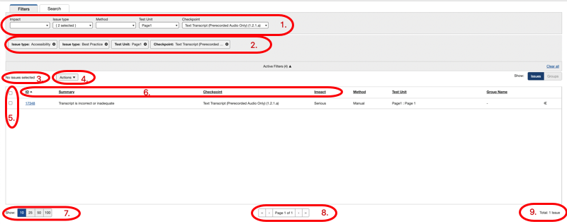 Several screens in the axe Auditor application display information in filterable, paginated tabular format (Issues, Test Cases, Test Runs, Home Screen, etc.). These tables have "global" features and functionality that are common across multiple screens, including various controls and tools for filtering, sorting, selection, and display. This topic lists each of them, and provides generic instructions for their use.