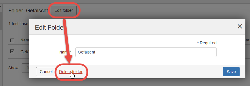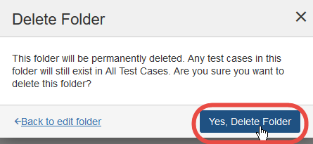 The Delete action for a folder moves all of its test cases to the 'All Test Cases' filter. In other words, it deletes the folder, but not the test cases within it. If you want to archive each test case within a folder you want to delete, refer to Archiving a Test Case.
