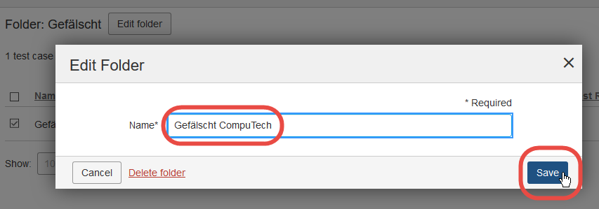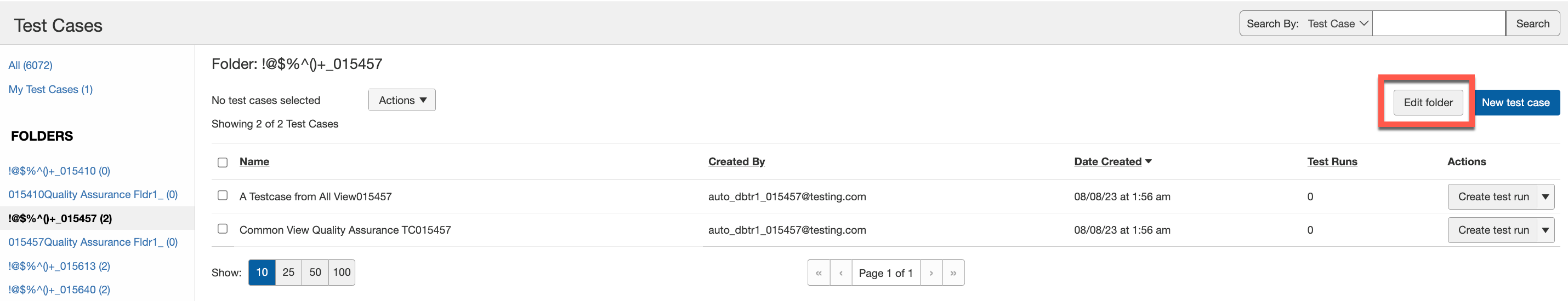 On the left sidebar pane of the Test Cases screen, click the folder name, then on the right pane, to the right of the folder name, click the Edit folder button.