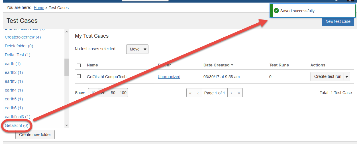 A message appears briefly at the top, right of the Test Cases screen to indicate successful creation, and the folder you created appears in the left sidebar menu.
