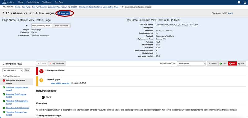 When using a checkpoint page, you may have occasion to quickly remind yourself of the details about the page under test. For quick reference purposes, this can be done with the Page Info button, which displays an expanded section below the button of key information about the testing page. You can then click the button again to collapse the section and preserve screen real estate.
