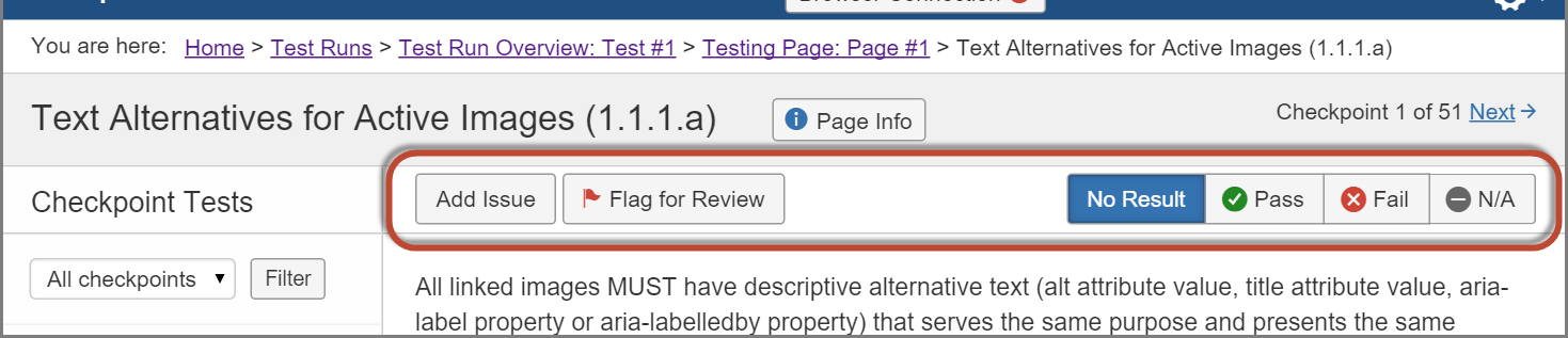- Mark (Assign) a Result (No Result, Pass, Fail, N/A): For more information, see Passing and Failing (Assigning Checkpoint Results).