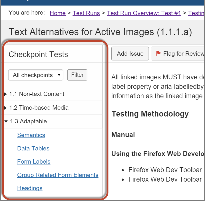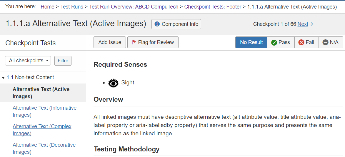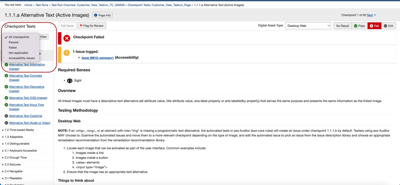 Individual screens for each checkpoint test are used to guide you through manual testing, one testing page (page under test) at a time. Following Deque's expert methodology and related content displayed on each of these checkpoint test screens increases the consistency and accuracy of your testing results. Regardless of the individual checkpoint screen accessed, each provides you with handy tools at the left and top of the body content area.