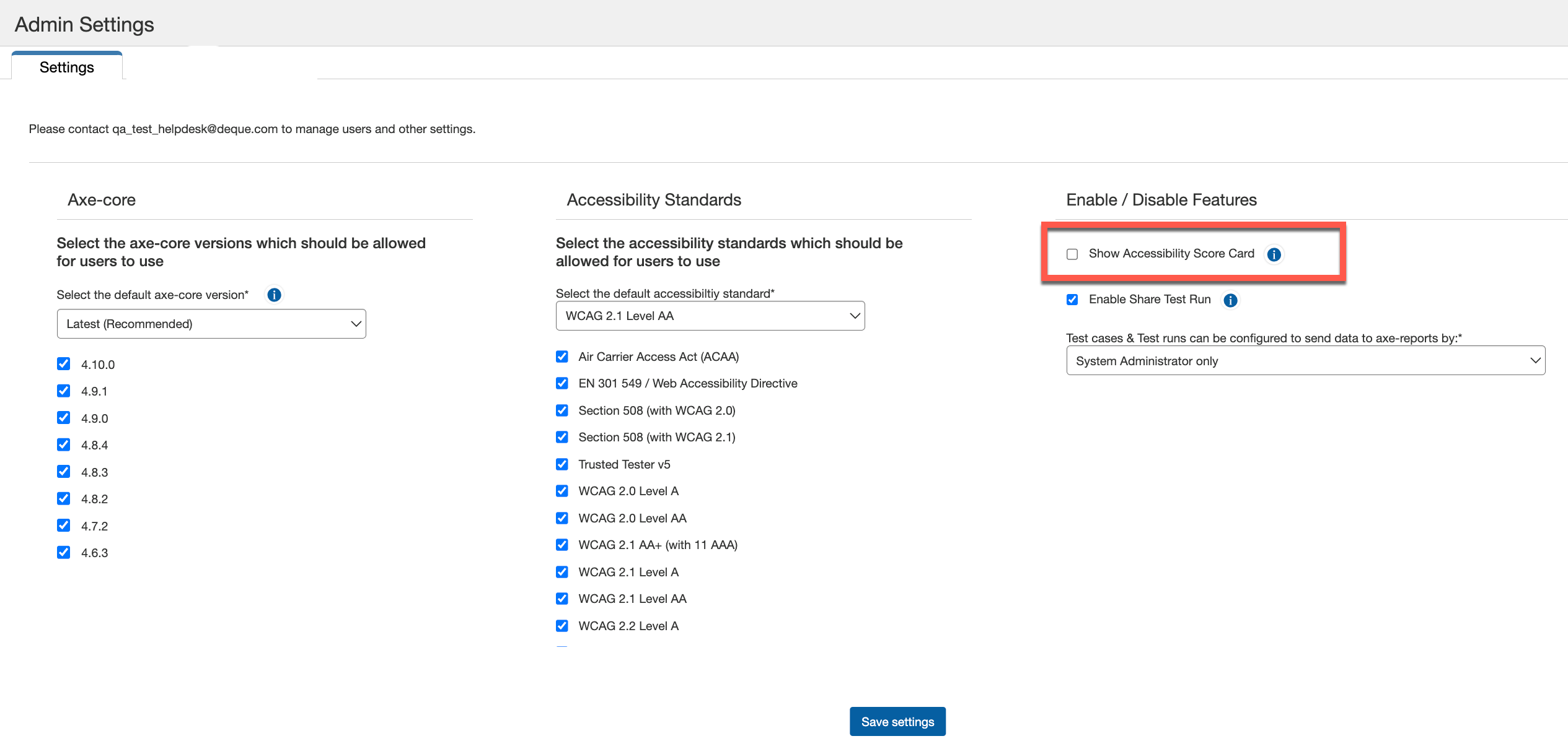 Enabling the checkbox, Show Accessibility Score Card displays the accessibility score graph for the users on the Test Run Overview page. This checkbox is enabled by default.