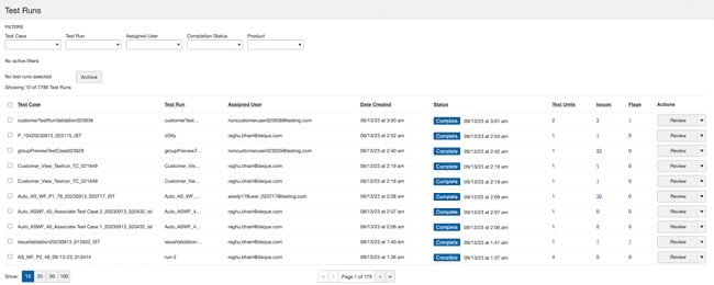 Archive: Select one or more rows in the left column checkbox(es) and then click a button at the top of the table to archive multiple test runs at the same time. Note: Be careful when selecting all, if test runs are not filtered it will select all and unarchiving action can only be performed by Deque helpdesk and can take a while. For more information, see Archiving a Test Run.