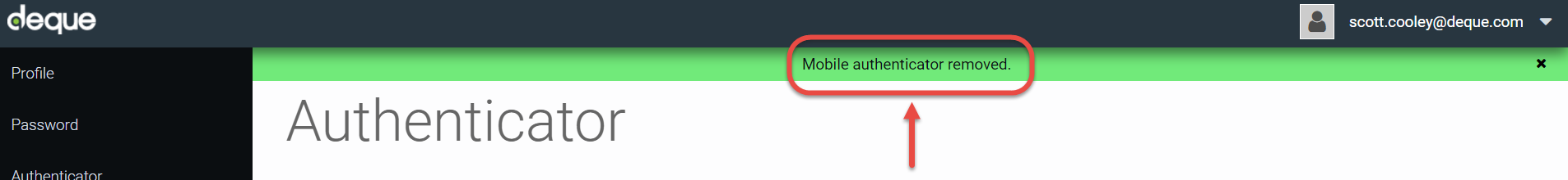 A system response message against a green background appears at the top of the Authenticator page to notify you of successful removal.