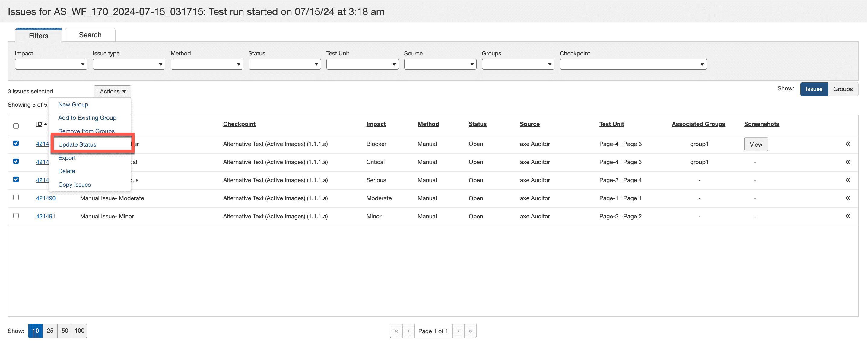 You can update the status of existing issues. You initiate the update status issue by using the drop down or by right clicking on the individual issue(s).