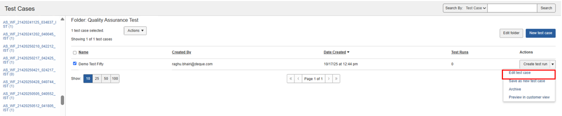 On the Test Cases page, expand the Actions drop-down for the test case you want to edit, and click Edit test case (or select Edit test case from the Actions column of the Test Runs table on either the Test Runs or Home screens).