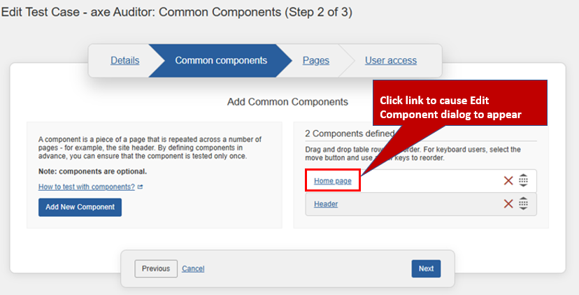 - To edit the details, be aware that the Next button at the bottom of the panel, or the tab links for either Common Components or Pages allow you to navigate away from the panel after making edits, and should you navigate back to the Details panel, those edits will remain. However, you must navigate to the Pages panel and click the Save Test Case button in order for those edits to become effective. For more information about editing the fields in the Details panel, see Adding Test Case Details.