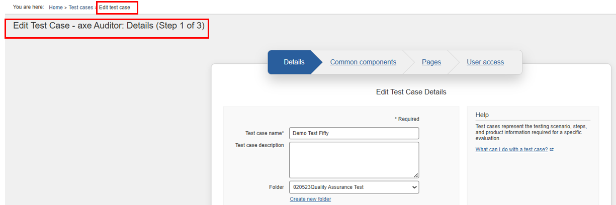 The Edit Test Case: Details (Step 1 of 3) screen appears, with the Details panel displayed by default. You can edit existing field values by modifying text entries and menu selections on each panel. then on the Pages panel, click the Save Test Case button to save the edits you make.