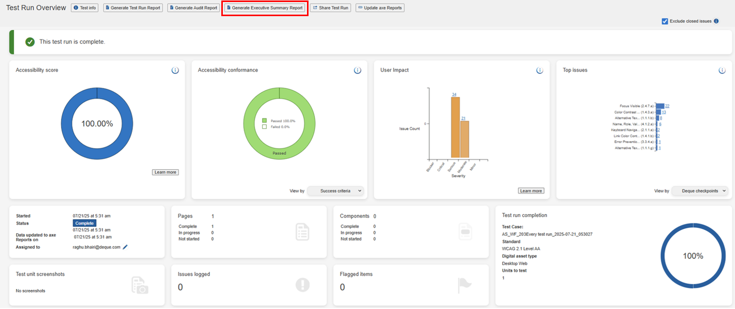 Generate a high-level Executive Summary Report from the Test Run Overview page (when enabled by admins). This report is designed for leadership and stakeholders who need accessibility insights without technical detail.