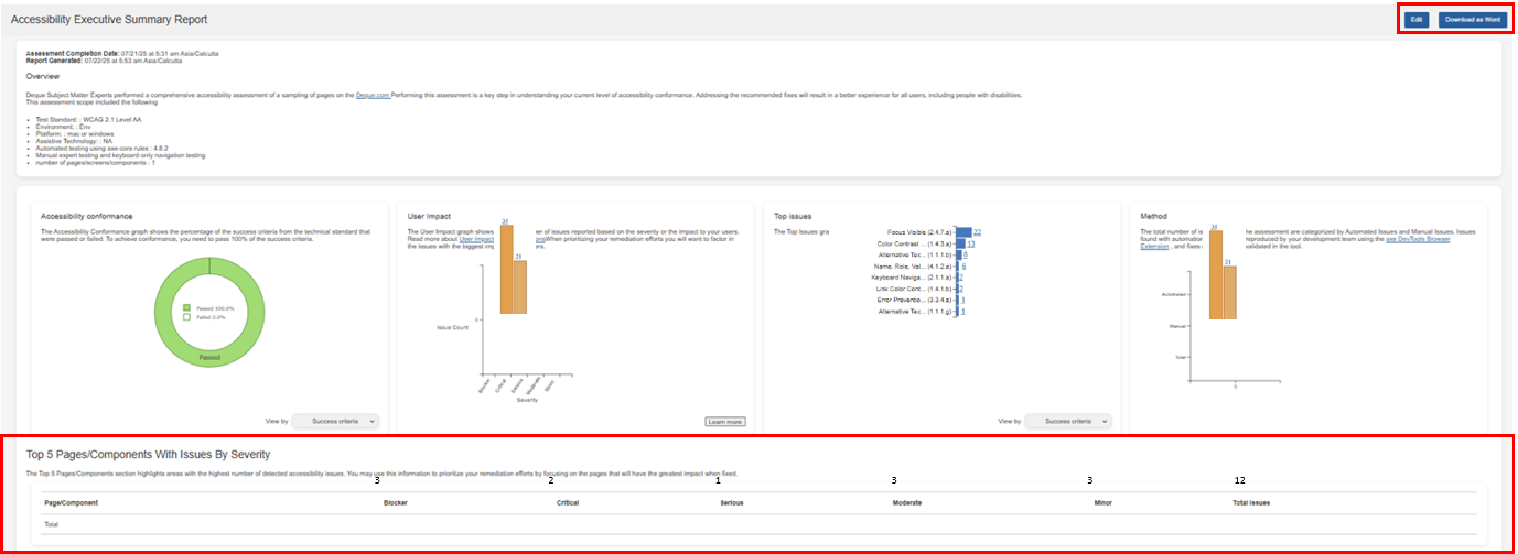 - Summarizes the top 5 affected pages or components, prioritized by issue severity (Blocker → Minor).