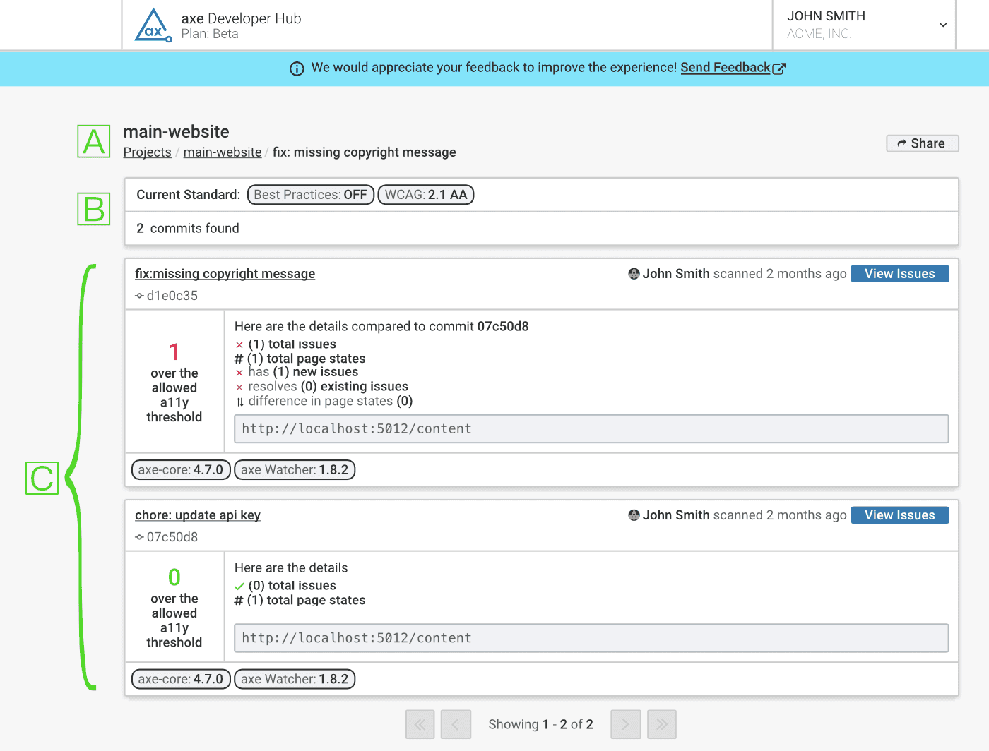 This page only contains those commits that were scanned by running your modified test suite. Running your modified test suite saves the current commit in the current branch, so you need to run your modified test suite on every commit and branch to save that information to axe Developer Hub.