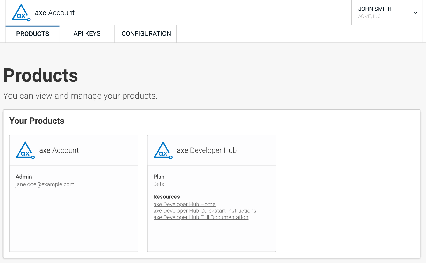 Click on the axe Developer Hub Home link to see the axe Developer Hub Projects page. You will see a page similar to the following: