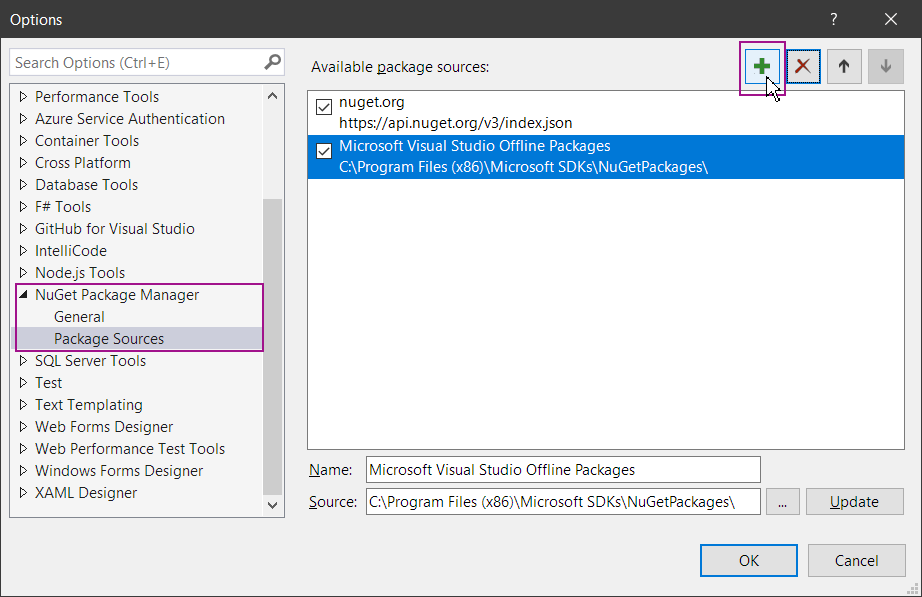 Step 2: Open the package source options via: Tools → Options → NuGet Package Manager → Package Sources and select + to add a new Package source: