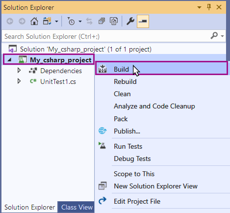 Step 7: Close the NugGet panel. Select your project in the solution explorer and access the context menu and select Build: