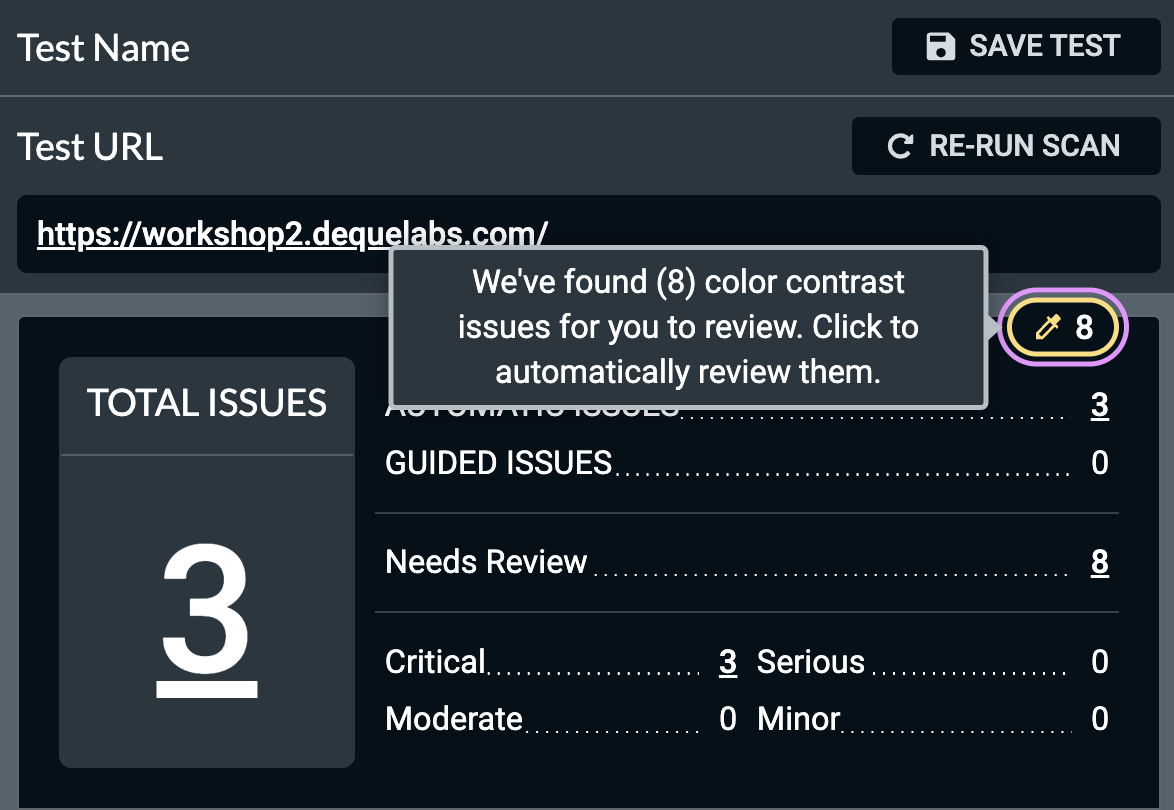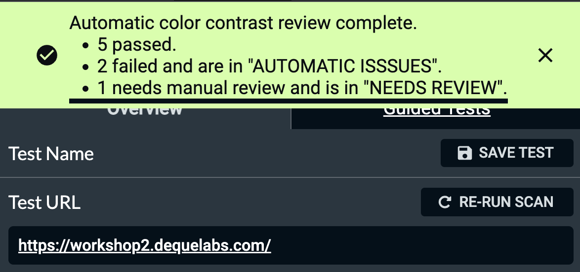 Users can opt in to having the tool run automatically after each scan completes. This may significantly increase the time it takes to finish each scan. In this mode, the color contrast tool will kick off immediately after the automatic scan completes.