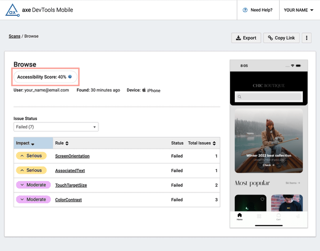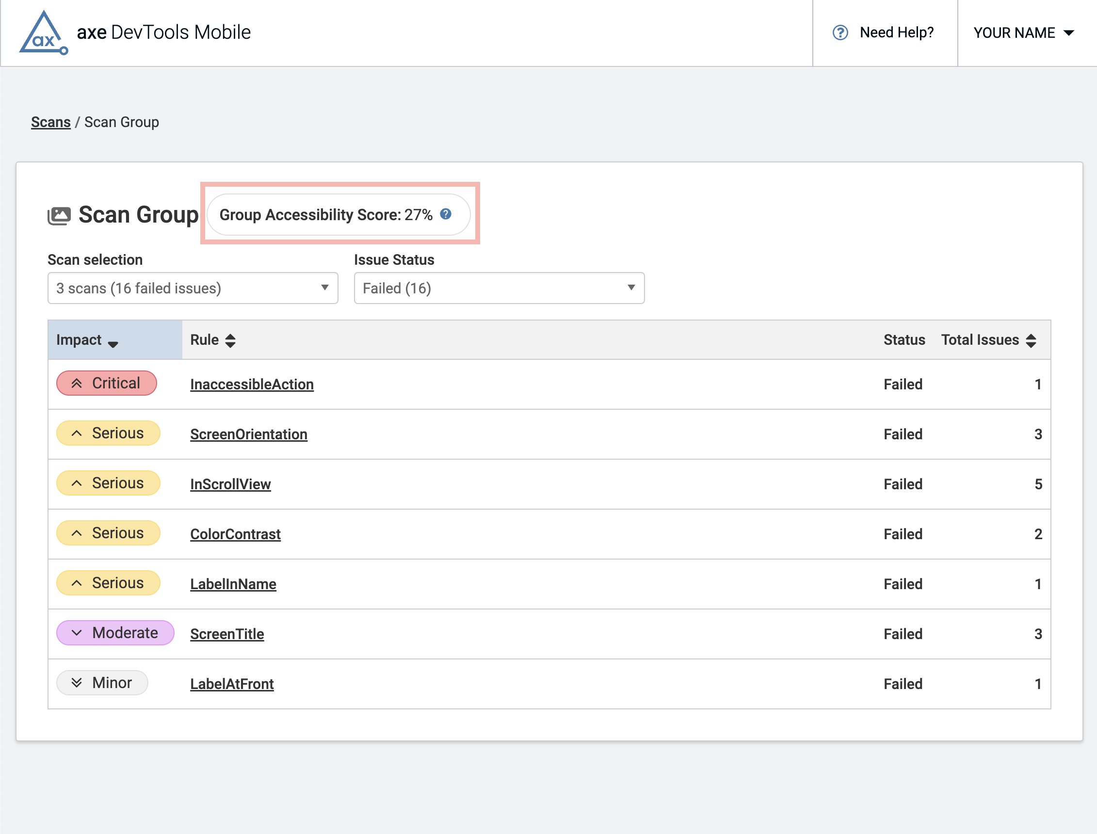 - You will see an Accessibility Score right below the name of the scan, followed by a table that displays data for all of the issues on that screen.