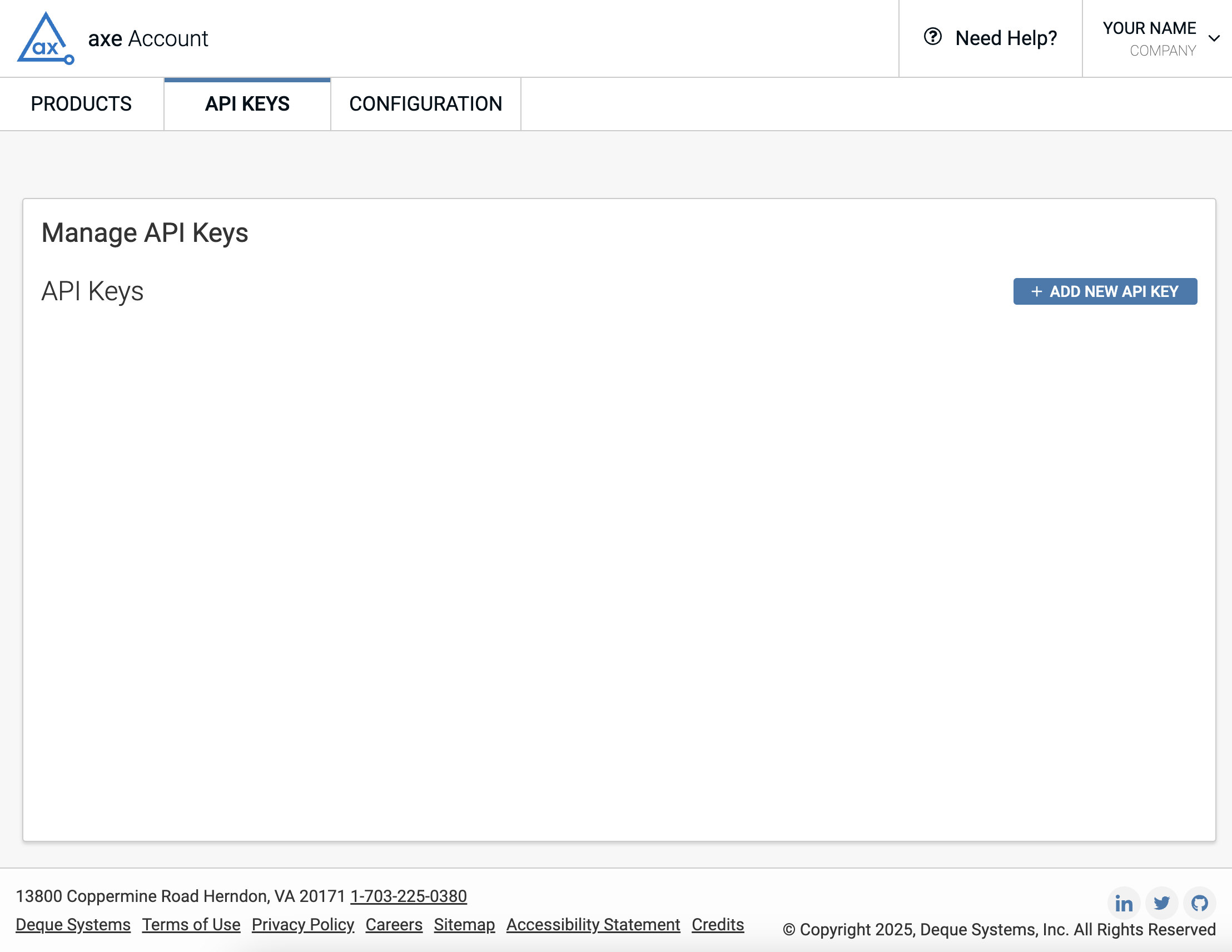 In order to get an API key for axe DevTools Mobile, you need to have an active license. Once you have access, visit API Keys to add a new key. After you log in, you will see a screen similar to this:
