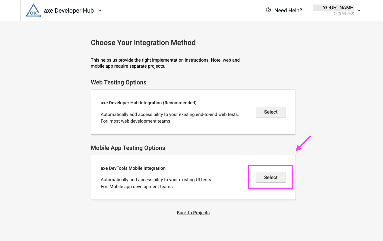 After adding a new project, you will pick an integration method for gathering accessibility data. Select the axe DevTools Mobile Integration.
