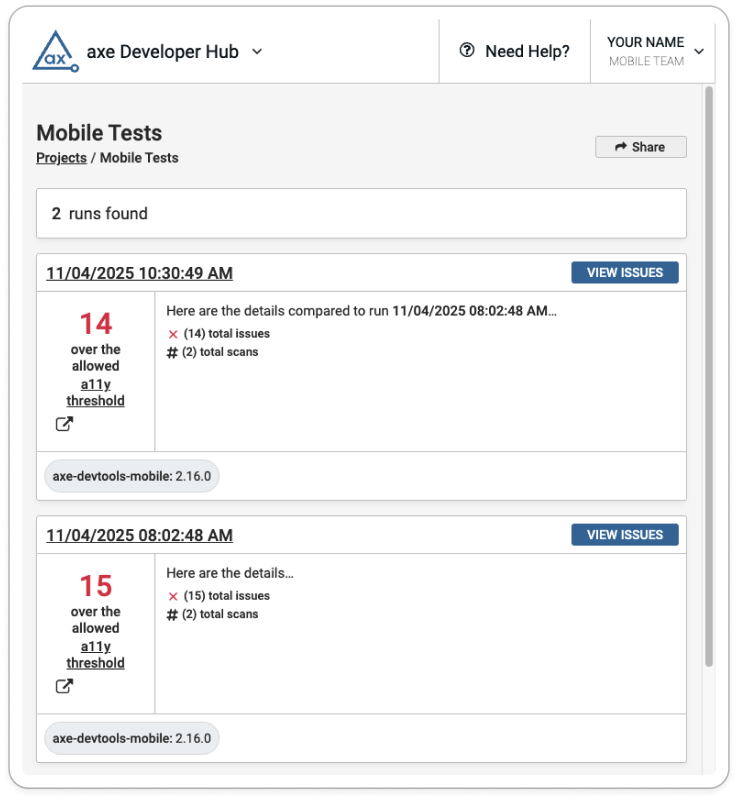 Start sending your test results to axe Developer Hub - a central location for viewing and managing accessibility issues, where scans are automatically grouped by test run. You can use Developer Hub with all of Deque's accessibility toolkits, so you can find results for web tests and mobile tests all in one place.