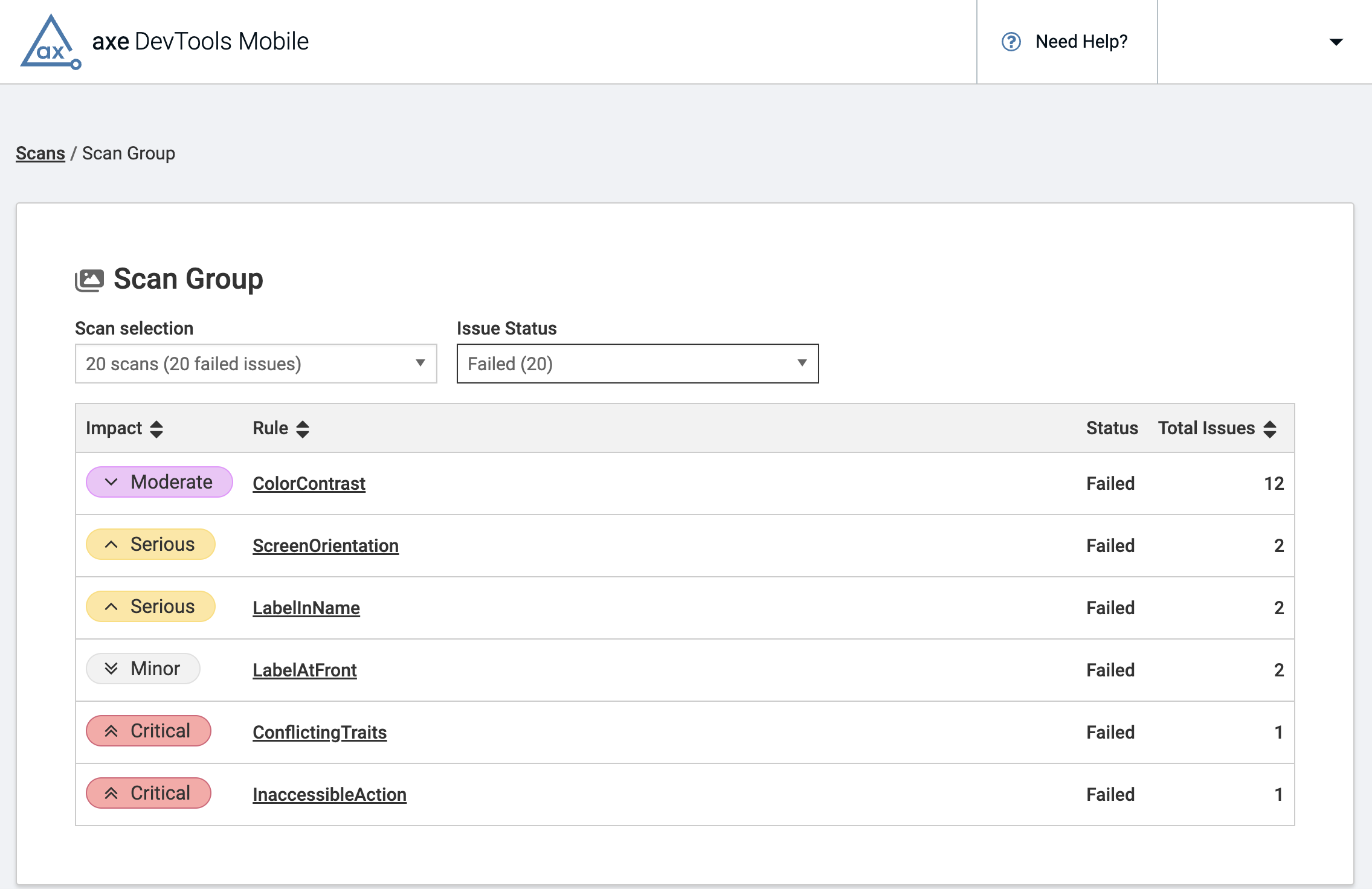 The results from the selected scans will be displayed in a table similar to the HTML report generated with the axe DevTools Reporter CLI but available directly in the dashboard.