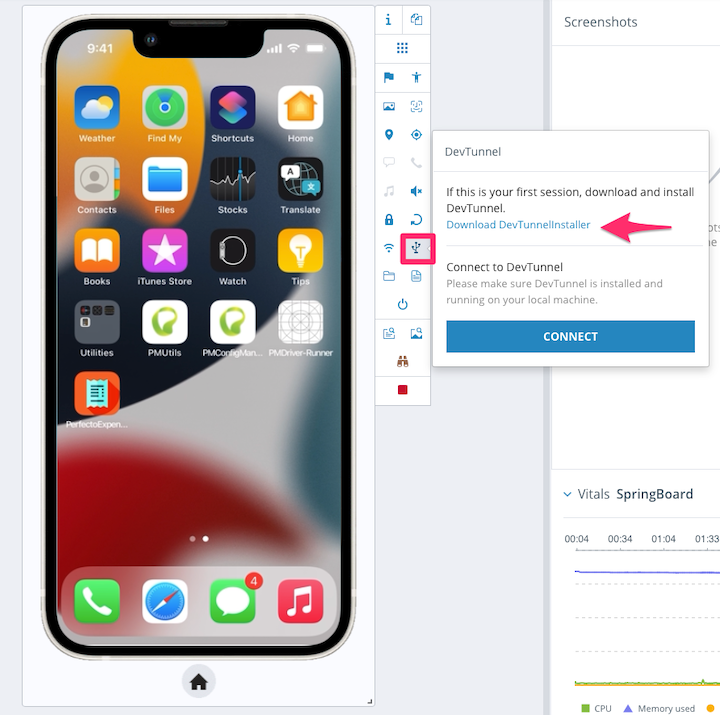 Start DevTunnel if you haven't already in a previous step: Select the "DevTunnel" button on Perfecto in the device interface, then "Connect". Note: Opening DevTunnel before Xcode helps ensure your cloud device is available to Xcode.