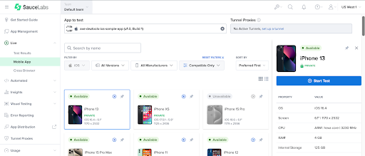 On the Sauce Labs dashboard, go to Live -> Mobile App, and select the “App to Test”. Ensure the app has been built for real devices and not simulators. Sauce Labs will show a tag next to the app that indicates whether it is built for a Simulator or a Real Device.
