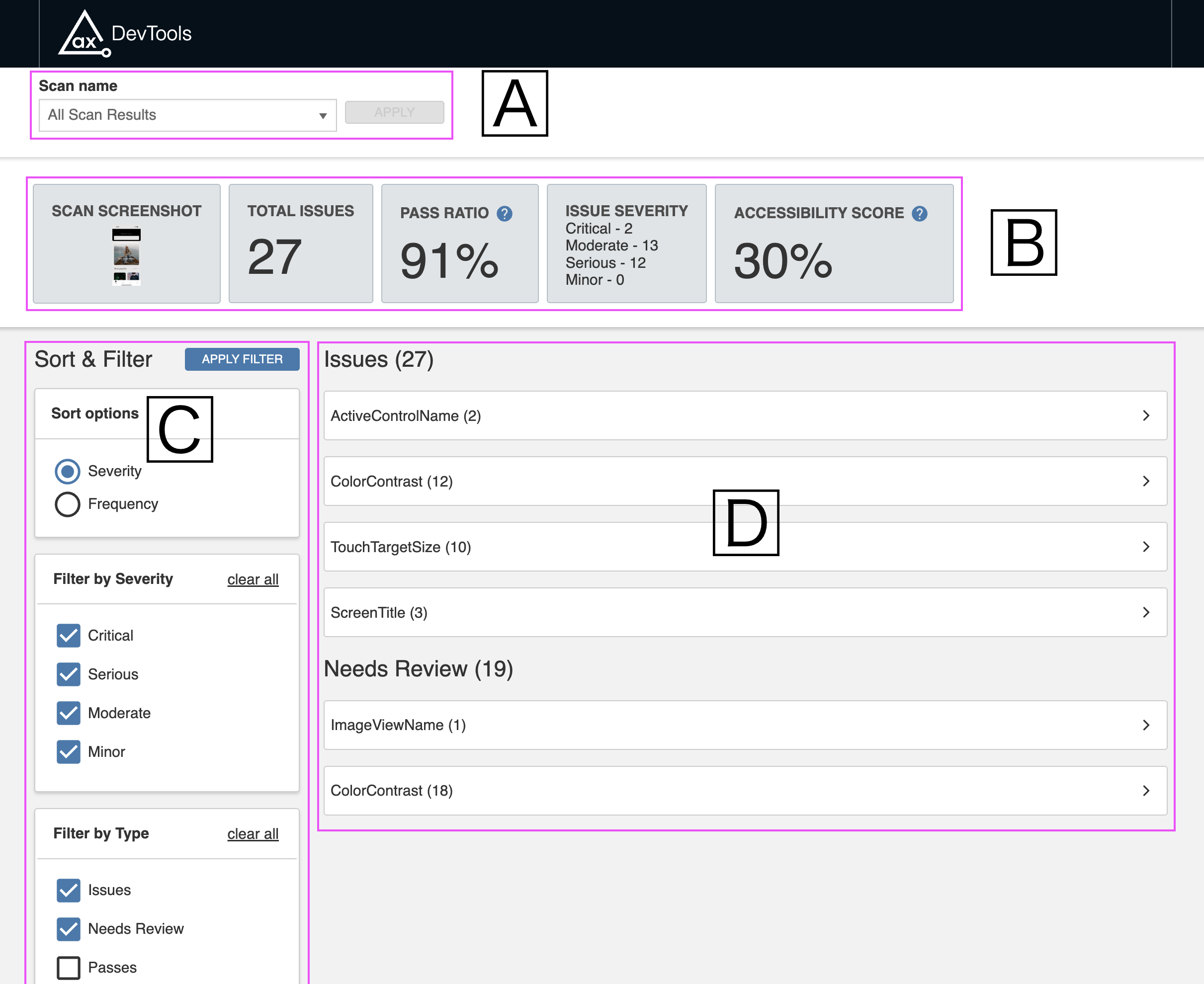 When you generate reports for one or more scans, you will see an executive report in that directory, in addition to scans for individual screens. You can select any one of these to open in your browser and view accessibility results. We recommend that you start with the executive-report.html, as this will provide data about the overall accessibility of the screens scanned in this group. Take a look at the example below and orient yourself to the user interface.