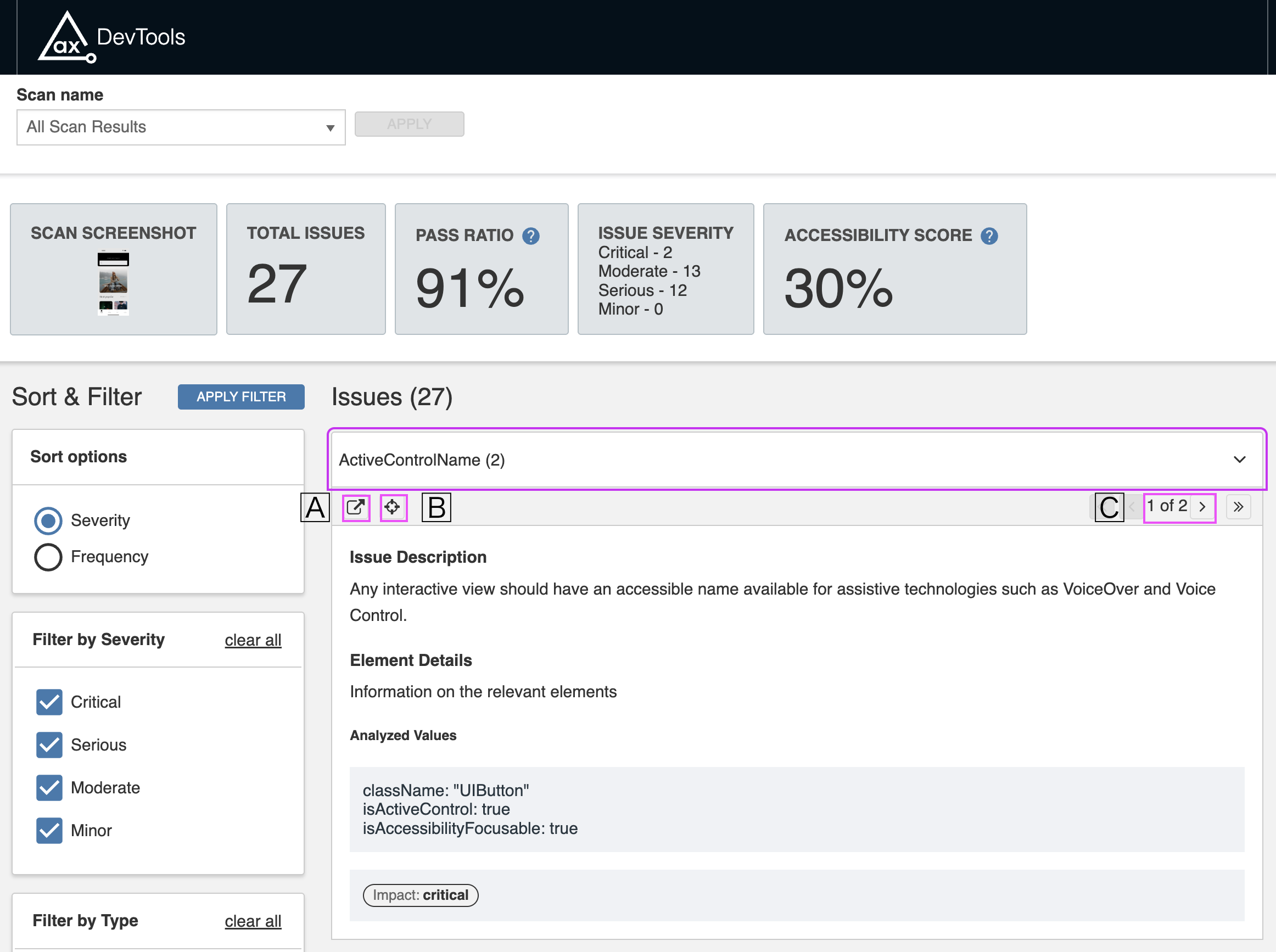 - Issue Number - A tally of the issues by level of severity. Learn more about the end-user impact.