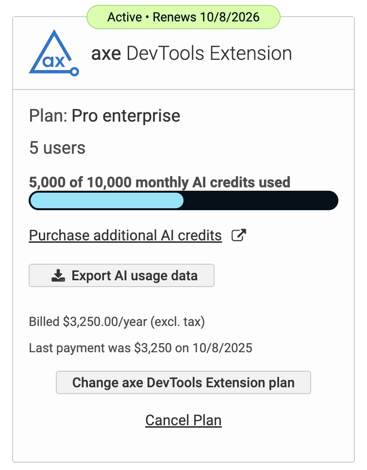 Each enterprise (or single license holder) with an axe DevTools Extension and/or axe DevTools for Web subscription receives a monthly allocation of AI credits that automatically resets at the beginning of each billing cycle. For multi-user enterprises, credits are managed at the enterprise level, allowing any team member with access to share from a common pool.