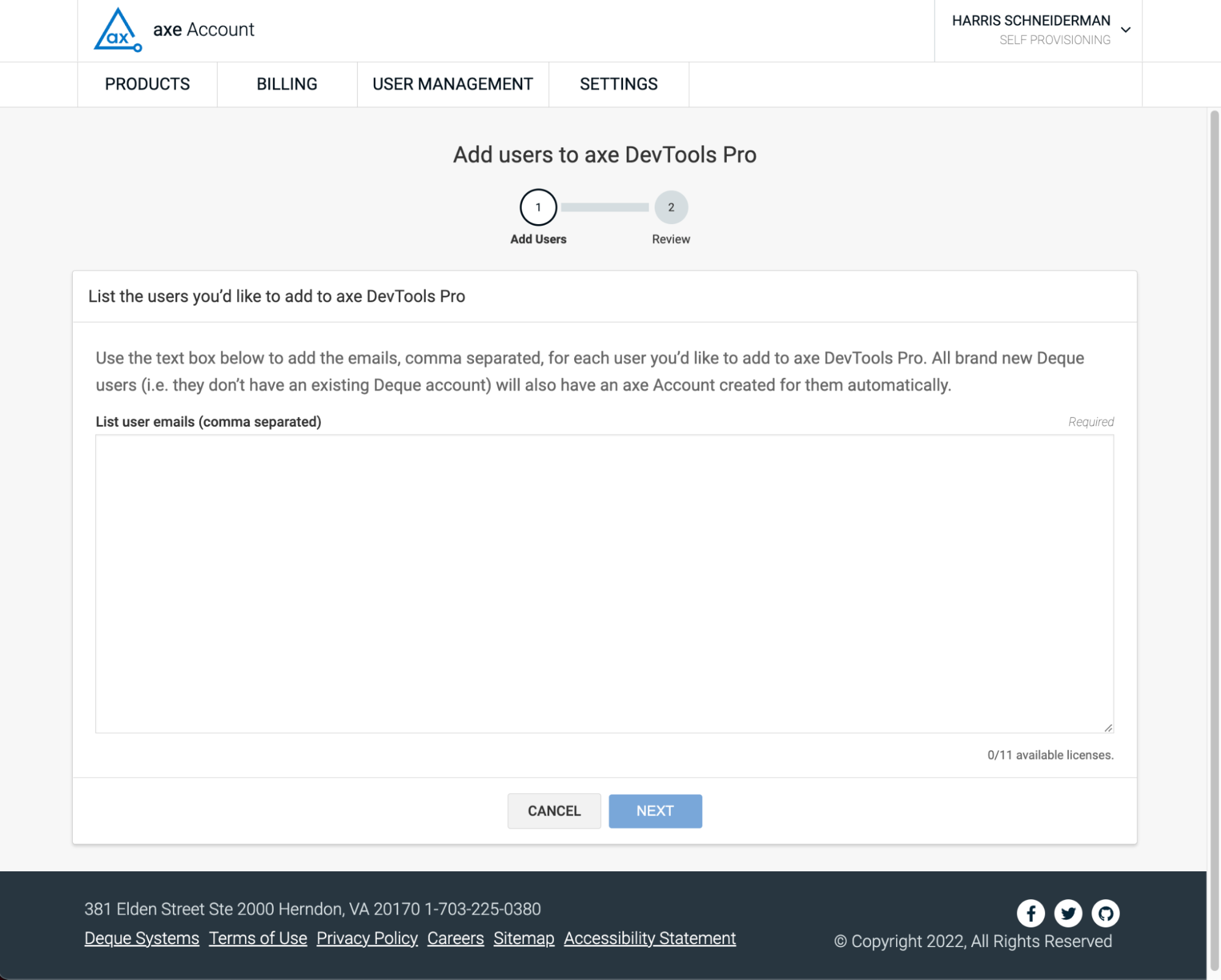 To add users to a product, enter each user's email address into the "List user emails" text box, separating each email with a comma. Admins can add up to 100 users at a time so if more than 100 licenses are being assigned it must be done in batches of 100. By adding users to a product, they will be granted "General Access" to both the given product as well as the axe Account.