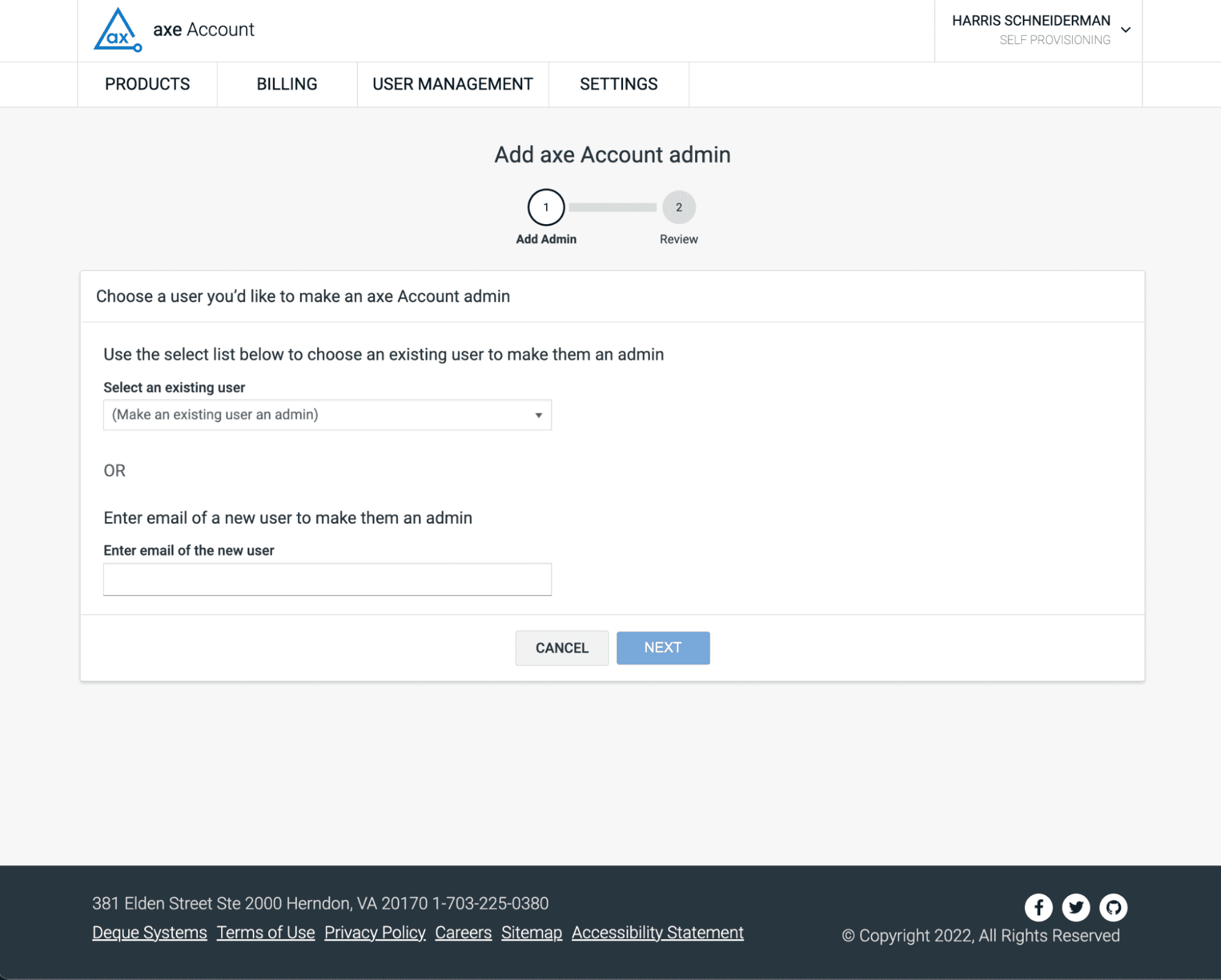 To add axe Account admins, click the "Add Users..." button and select the "...as an axe Account Admin" menu item. Administrators can add additional administrators by selecting an existing user from the "Select an existing user" dropdown or entering the email address of a new user who will be invited into the "Enter email of the new user" text field.