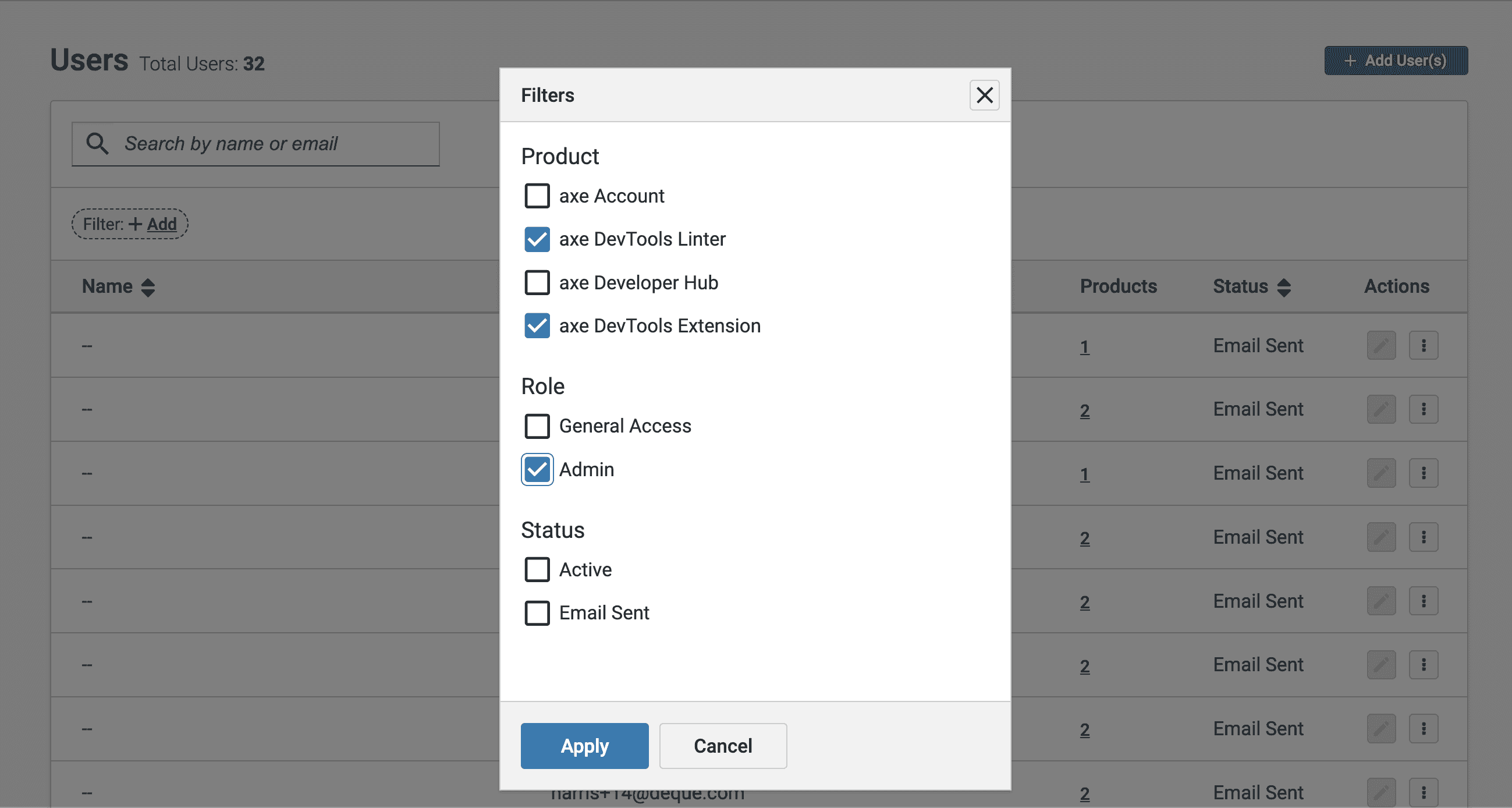 Admins can filter the user table by any combination of Product, Role, and Status. The product filters will filter users by access to the given product. If multiple products are selected, users who have access to any of the selected products will be returned. If 1 or more products are selected in addition to a role, only users who have the selected role who have access to any of the selected product will be returned.