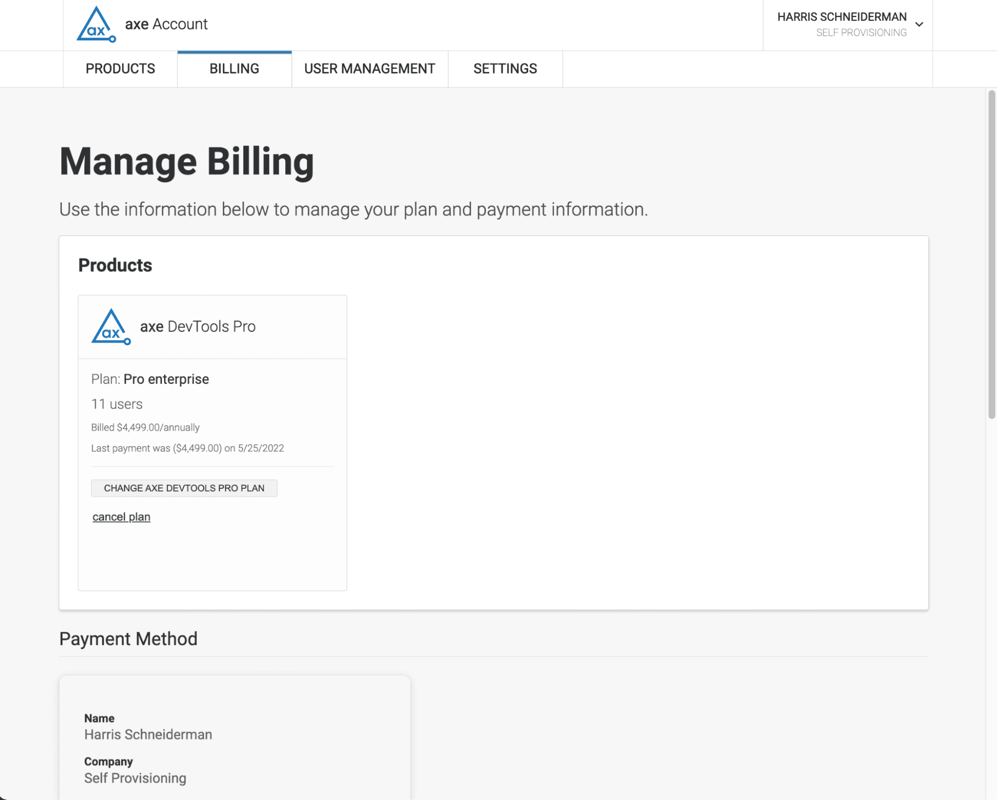 For subscriptions purchased offline, administrators will not be able to manage billing information in the axe Account Portal. This means that the payment method, company info, and invoices will not be available to be viewed or altered. In addition, admins for enterprise subscriptions purchased offline will not have access to directly change the subscription (license count, etc.) in any way within the axe Account Portal. Instead offline administrators can reach out to their Deque contact to change billing and subscription information.