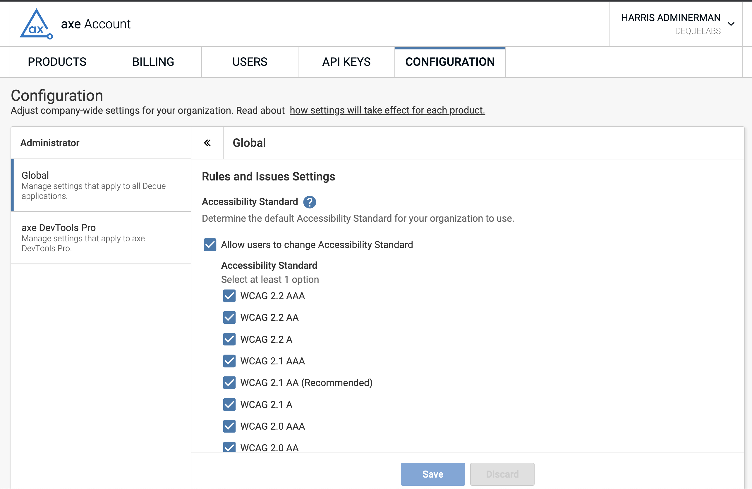 The axe Configuration page can be found on axe.deque.com/configuration. Once there, users will be presented with a "Global" configuration panel as well as links to configure other Deque products they have access to.
