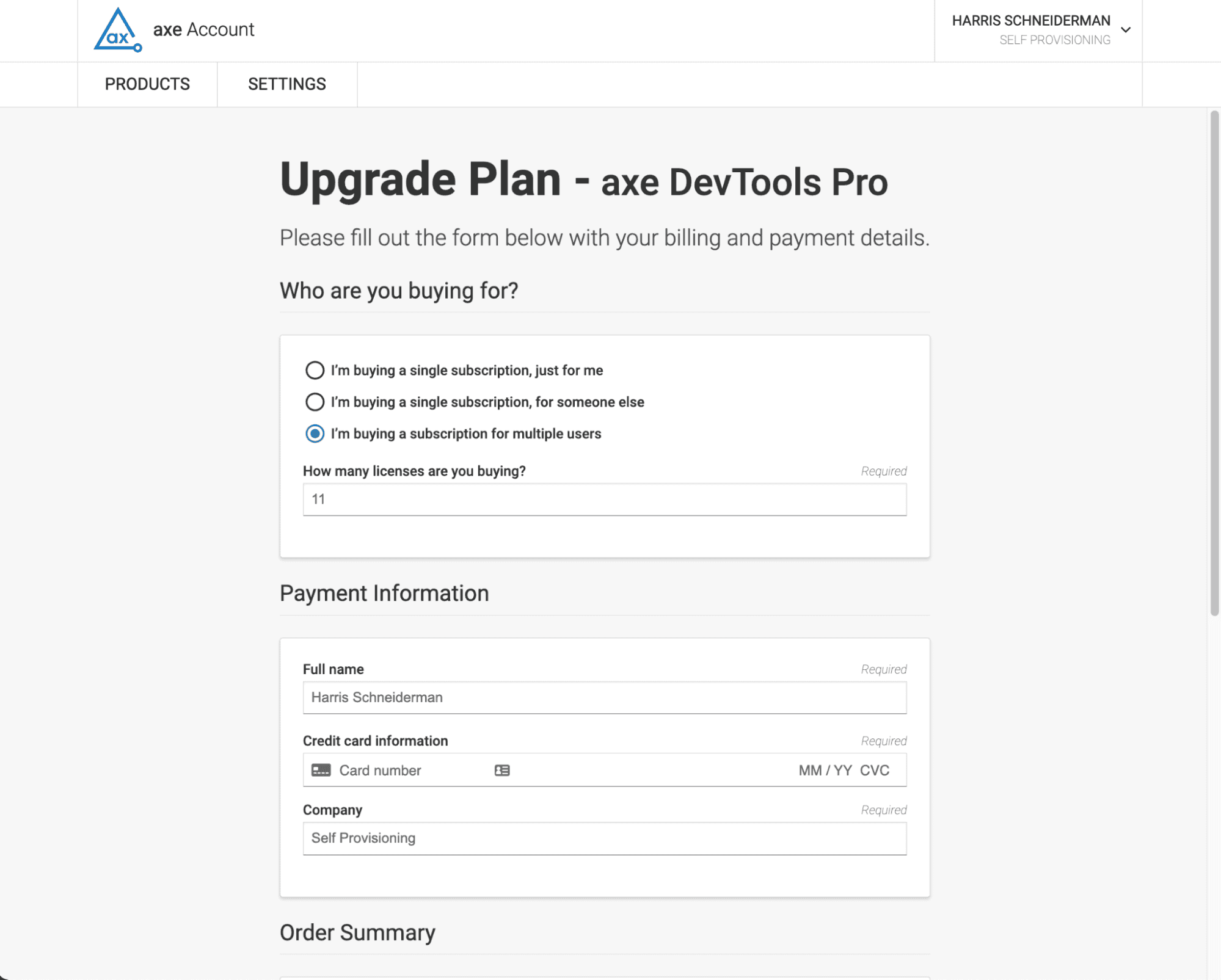 - Now that you have a trial you can upgrade by clicking the "axe DevTools Extension Plans" link. A new tab will open and bring you to the plans page where you can click "UPGRADE NOW" to purchase a Pro subscription for 1 or more users.
