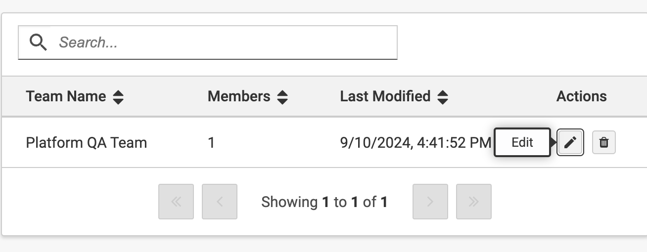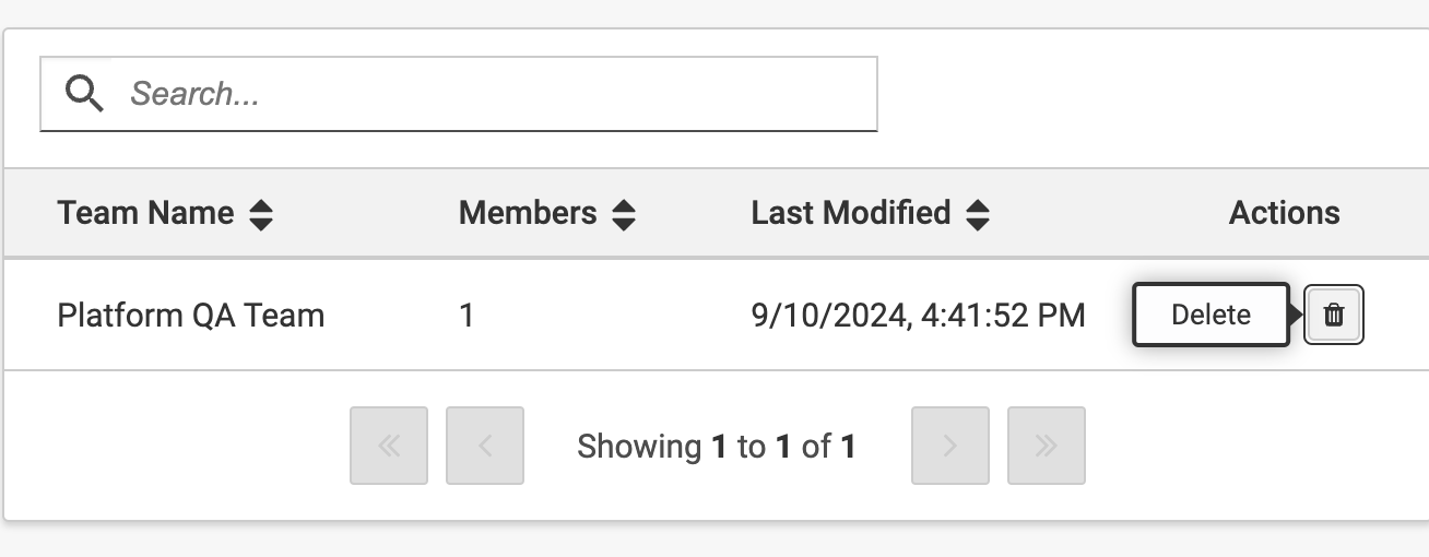 To view your enterprise's teams, navigate to the "TEAMS" page. Here you will have access to a sortable, searchable table listing all teams. For each team, the name, number of members, date/time of last modification along with edit and delete actions are listed. The following information is available for each team: